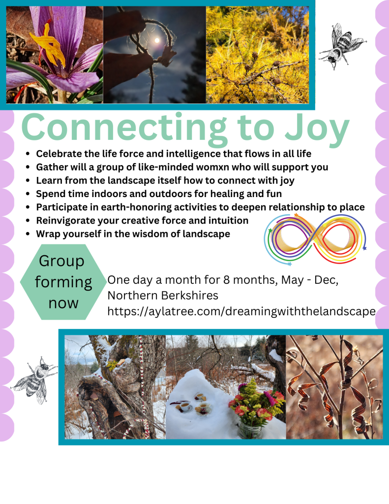 If you answer yes to many or even some of these questions, the Connecting with Joy program may be for you. We will walk the landscape and do ceremony with the plants and animals who share the same home. We will drink teas, craft items of intention to support our journey, get our hands dirty in the soils of Earth, talk about mythos as we work with some of the wisdom that bees offer us as a gift, through writings and drawings of the Melissae, bee priestesses, who celebrated the bees and their teachings in ancient Greece. Check out Whispers from the Bee on Facebook or Instagram if you would like to get to know me more.